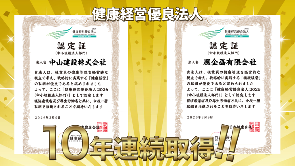 この度、弊社中山建設株式会社と、グループ会社颯企画有限会社がともに経済産業省「健康優良法人2026」の認定をいただきました。